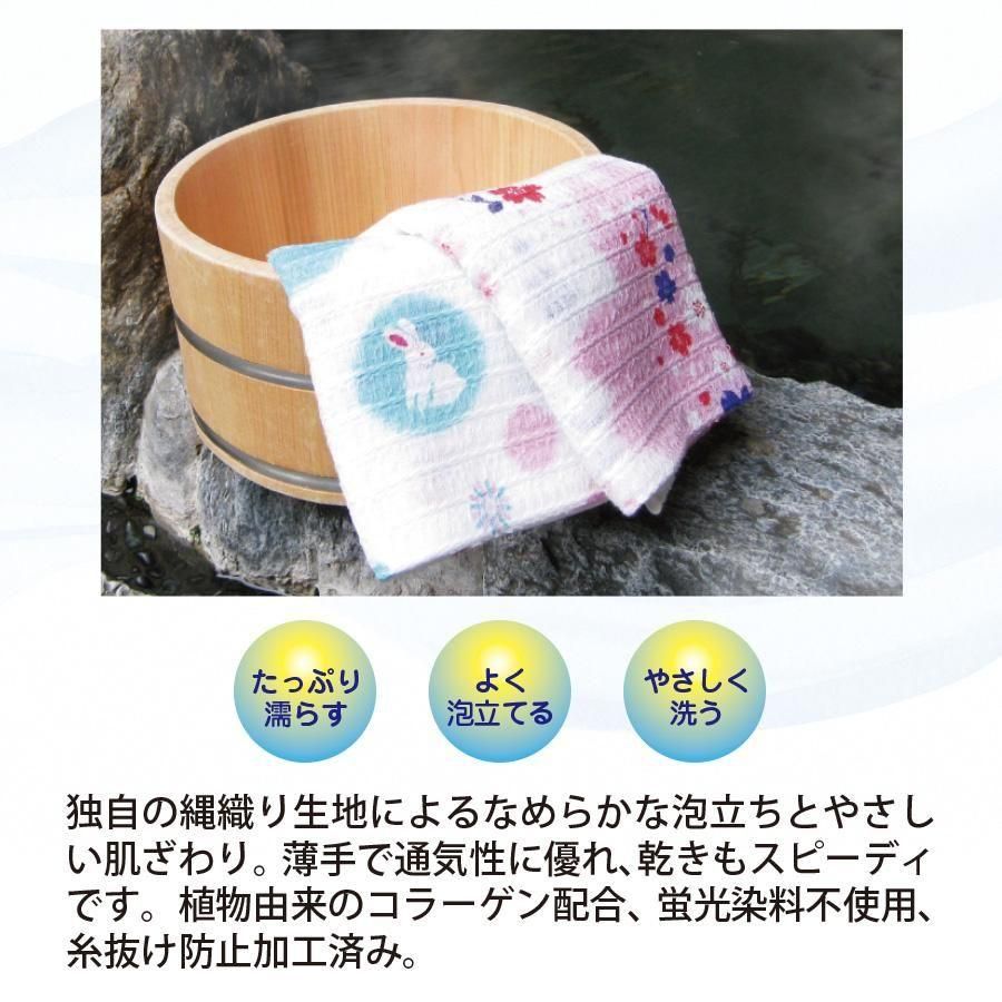 独自の縄織り生地によるなめらかな泡立ちとやさしい肌ざわり。薄手で通気性に優れ、乾きもスピーディです。植物由来のコラーゲン配合、蛍光染料不使用、糸抜け防止加工済み。